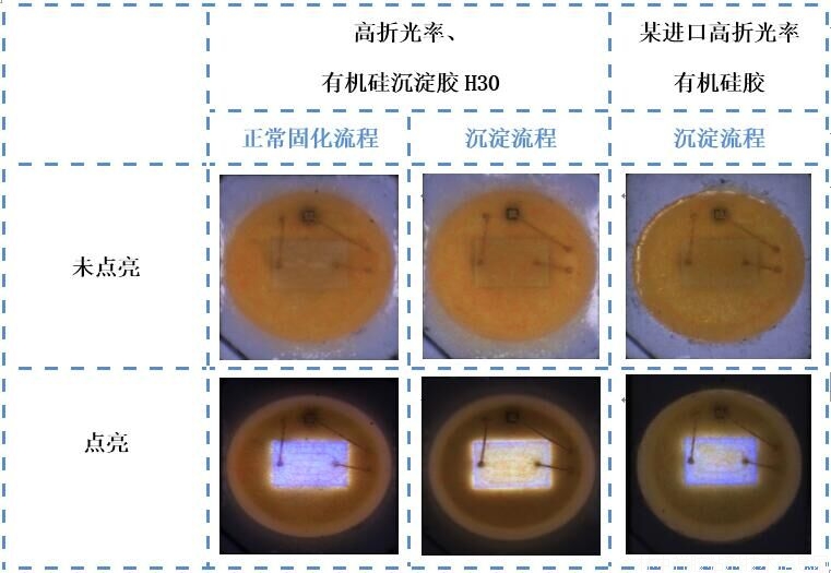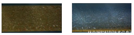 圖3. 三色熒光粉和高折有機硅膠H30混合物固化后橫切面對比圖(圖左:采用正常固化流程,三色熒光粉較均勻地分散在硅膠中;圖右:采用沉淀+固化流程,三色熒光粉均勻地分散在硅膠底部)。