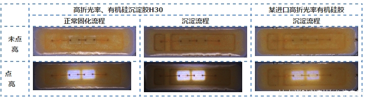 圖2. SMD熒光粉保形涂層:使用高折光率、有機硅沉淀膠H30,通過點膠實現熒光粉保形涂層(7020 SMD支架)。