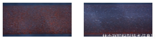 圖4. 紅色熒光粉和高折有機硅膠H30混合物固化后橫切面對比圖(圖左:采用正常固化流程,紅熒光粉較均勻地分散在硅膠中;圖右:采用沉淀+固化流程,紅熒光粉較均勻地分散在硅膠底部)。