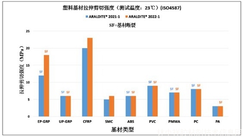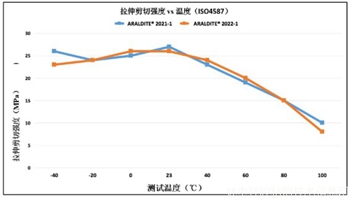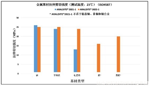 嚴(yán)格測(cè)試表明,ARALDITE®2021-1與ARALDITE®2022-1在多種基材和較大溫度范圍內(nèi)均表現(xiàn)出良好的拉伸剪切強(qiáng)度,細(xì)節(jié)如下圖所示。