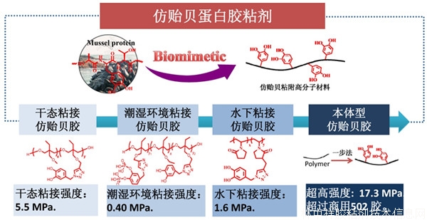 貽貝蛋白以在水下具備高強的粘附能力而聞名。根據仿生學原理,通過將貽貝粘附蛋白功能元(鄰苯二酚基團)與合成高分子相結合,達到復制甚至超越天然貽貝粘附蛋白粘附效力的目的,是目前仿貽貝蛋白膠粘劑(以下簡稱仿貽貝膠)領域研究熱點之一。近年來,青島能源所生物基材料重點實驗室萬曉波研究員率領的生物基及仿生高分子材料團隊一直致力于仿貽貝膠的研究,并取得了一系列進展。