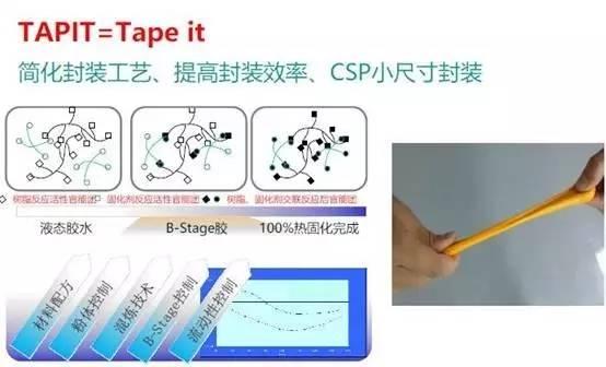 譚曉華還表示,該封裝的原理就是因為B-Stage膠可以無限拉長,到了60度的時候開始有流動性,因此這項封裝工藝就是利用了它在60-80°左右恢復(fù)流動性以及提升黏性的時候,完成對倒裝芯片的封裝。