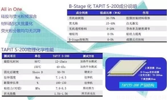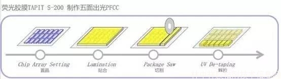 PFCC是指Phosphor Flip Coated Chip,即采用一種半固化符合熒光粉的有機(jī)硅膠膜穿透芯片,形成五面發(fā)光結(jié)構(gòu)。而德高化成的熒光硅膠膜TAPIT采用是B-Stage膠,而不是普通的膠水。