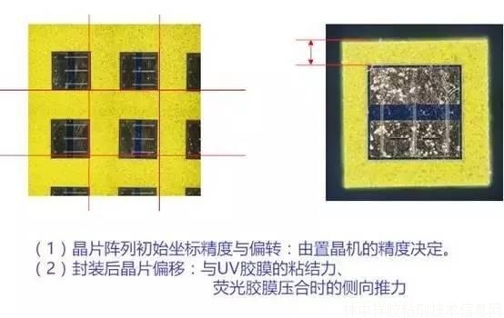 首先是置晶的精度,也就是坐標(biāo)位移偏轉(zhuǎn),這跟置晶機(jī)精度有關(guān)。由于在貼膜的過程中會受到來自熒光膠流動的推動力,因此可能會把芯片推到旁邊的位置。但通過各種工藝的調(diào)校與控制,基本上可以控制偏轉(zhuǎn)的問題。