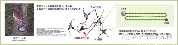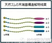 盡管以前研究人員就認為天然橡膠的末端基(ω末端、α末端)會形成分支結構,但并未查明其詳細結構(圖2)。此次的研究發現,天然橡膠的ω末端為二甲烯丙基,α末端的結構由4個不同結構混合而成,其中兩個結構對形成分支結構和凝膠作出了貢獻(圖3)。