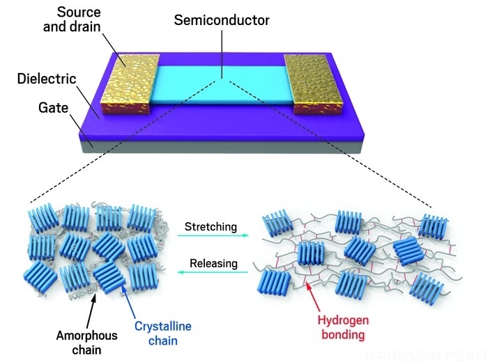 這種彈性晶體管由兩部分組成:一是剛性的半導體,二是連接這些半導體的無定形鏈。拉伸時,無定形鏈間由氫鍵連接,收縮時氫鍵斷裂吸收機械應力。來源:Nature/cen.acs.org