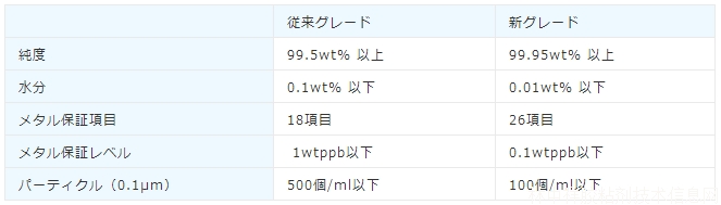 新級別產品的水分從原來的0.10wt%以下減至0.01wt%以下。金屬保證項目從18項增至26項,金屬保證級別從1.0wtppb以下提高到0.1wtppb以下。每mL的顆粒(0.1μm)數量從500個以下減少至100個以下。