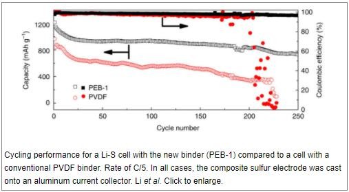 相較于傳統型鋰硫電池,新款聚合物粘合劑的電容量翻了一番,即使在高電流密度(high current densities)下放電上百次也同樣如此。